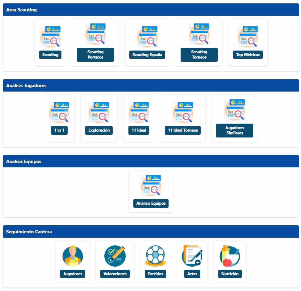 Es una herramienta centralizadora que pone en colaboración a varios perfiles de usuarios dentro de tu club. En ella se puede integrar todos los productos analíticos de la secretaria técnica. Los responsables de la cantera podrán introducir información de todos los datos de los jugadores, actas, análisis clínicos, etc. También podrá ser utilizado como gestor documental.